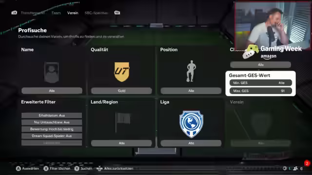 00:24:54Ein Fokus des Streams liegt auf dem FIFA Ultimate Team Content. Es wird die Arnold SBC kurz behandelt und der Streamer prognostiziert, dass Arnold wahrscheinlich kein Bild erhalten wird. Der Hauptteil des Abschnitts widmet sich dem Aufbau eines Teams für FIFA 26. Es werden verschiedene Spielerkarten wie Figo, Angra, Nüsken und Saliba diskutiert. Der Streamer geht detailliert auf die Budgetoptionen und die Suche nach Karten bestimmter Jahrgänge, insbesondere aus den späten 90ern, ein, um ein potentielles Team zu erstellen.