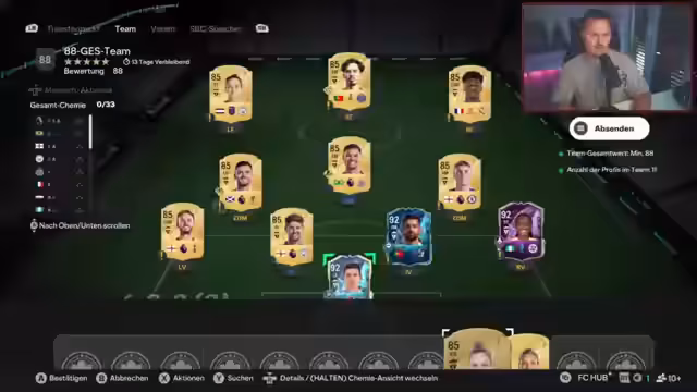 02:42:50Der Fokus verlagert sich auf das Gameplay von FIFA, wobei SBCs (Squad Building Challenges) im Vordergrund stehen. Spieler Modric wird gelobt, fühlt sich aber physisch zu schwach an. Gegen einen schnellen Gegner mit einem Spieler namens Soares fühlt sich der Sprecher machtlos und stellt fest, dass Tempo in der aktuellen Meta über alles steht. Im SBC-Prozess wird versucht, eine 89er-Liga-Mannschaft zu erstellen, wobei der SBC 'Evo' die Möglichkeit bietet, Spielerpositionen zu verändern. Bei der Wahl des Stürmers wird die Abwägung zwischen Modric im Mittelfeld und Van Persie als Sturmer vorgenommen, wobei die letztendliche Wahl vom benötigten Spielerprofil abhängt.