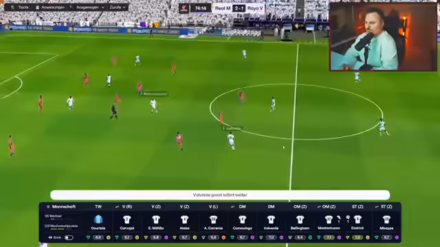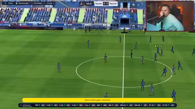 04:49:54Der Streamer wechselt in sein Fußballmanager-Spiel und denkt über eine taktische Veränderung nach. Nachdem er mit einer provisorischen Aufstellung nicht erfolgreich war, will er für die zweite Halbzeit mehr Offensivkraft einbringen, indem er Bellingham und Ada bringt und die Angriffe intensiviert. Er erkennt an, dass bisher zu wenig Torgefahr erzeugt wurde und eine Umbestellung notwendig ist.
