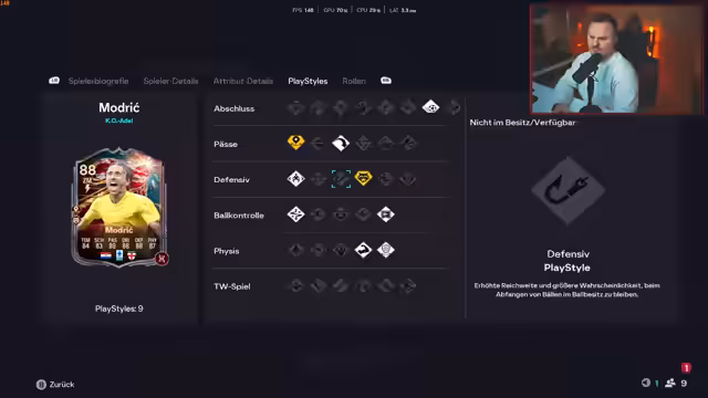 01:36:19Nach den Spielen wird eine detaillierte Analyse einzelner Spieler vorgenommen. Petit wird für seine immense physische Präsenz und seine Balleroberungen gelobt, auch wenn seine Dribbling-Werte nicht herausragen. Es wird vermutet, dass sein einzigartiger Bodytype (enge Kleidung, Pferdeschwanz) zu seiner Spielweise beiträgt. Bei Modric wird die Frage diskutiert, welcher Playstyle am besten zu ihm passt. Während Quickstep in Gold als potenziell nicht ideal empfunden wird, werden andere Karten wie Shadow oder Katalyst als mögliche Alternativen in Betracht gezogen. Der Streamer betont, dass die Playstyles das Spielgefühl maßgeblich beeinflussen.