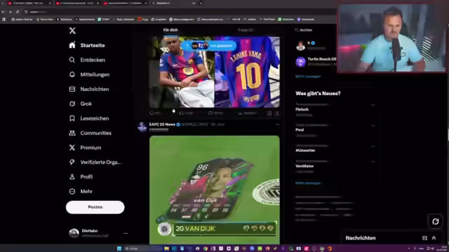 01:49:32Der Streamer kündigt Content um 19 Uhr an und bittet einen Chat-Participant namens Raffi um Einladung für ein Spiel. Er spricht über verschiedene Spieler-Karten wie den Lino und den Kobel, die er als 'stabil' und 'sauber' beschreibt. Er erwähnt auch den Start der La Liga in zwei Wochen und die mögliche Verschiebung des Spielplans von Real Madrid aufgrund der Klub-WM. Der Streamer diskutiert auch über die Herausforderungen beim Aufbau eines Teams für einen speziellen Cup und die Notwendigkeit, bestimmte Kriterien zu erfüllen.