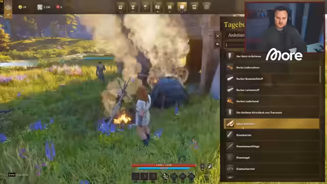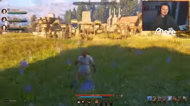 05:30:15Der Stream wechselt abrupt zum Survival-MMORPG Pax Dei. Der Streamer kämpft anfänglich mit technischen Problemen, sein Charakter hat einen komischen Gang, was auf einen möglichen Fußbruch hindeuten könnte. Trotz der Hürden erkundet er die Umgebung und stellt fest, dass das Spiel beeindruckend ist, was insbesondere die detailverliebenen Bauwerke der anderen Spieler betrifft. Er beschreibt seine Zielsetzung, eine funktionierende kleine Hütte zu besitzen.