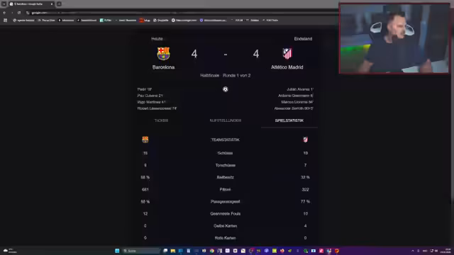 00:43:02Der Streamer beginnt mit dem Live-Gameplay von Barcelona gegen Atletico Madrid. Er kommentiert das Spielgeschehen, analysiert die Spielzweise beider Teams und äußert sich über die Leistung der Spieler. Atletico geht früh mit 2-0 in Führung, was der Streamer als beeindruckend bezeichnet. Er bewundert die Organisation und Konterstärke von Atletico.