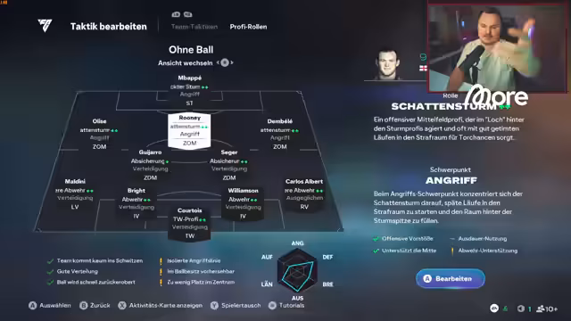 04:58:12Der Streamer vergleicht im Detail die Spielweise und Eindrücke von Stürmern wie Dembélé und Mbappé. Während Mbappé sich aggressiver und direkter anfühlte, wirkte Dembélé für ihn unauffällig und zu langsam. Dies führe dazu, dass man bei Dembélé seine Stärken gezielt forcieren müsse. Bei der Formation 4-2-3-1 experimentierte er mit drei ZOMs, bemerkte aber defensive Schwächen. Er favorisierte eher das 4-4-1-1, da es alles mitbringe, was das Herz begehre, wenn man die Manuel-Steuerung für die Flügelspieler meistere.
