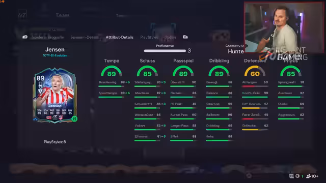 05:14:36Ein Zuschauer fragte nach der Wahl zwischen einem LM Mbappé und Alex Sanchez. Der Streamer empfahl Alex Sanchez, da Goldkarten in seinen Teams nichts mehr zu suchen hätten und Sanchez eine coole und günstige SBC sei. Bei der Frage nach der Wichtigkeit von Pass-Playstyles für Außenverteidiger, antwortete er, dass diese zwar grundsätzlich ein Mehrwert seien, für ihn aber nicht essentiell, da seine Verteidiger primär defensiv agierten und kaum Pässe spielten. Er kritisierte zudem den Playstyle „Press Proven“ als „Trash“ in Gold, da er keinen Mehrwert bringe.