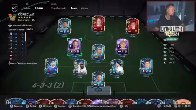 04:17:37Der Streamer wechselt das Thema zu EA Sports FC und testet verschiedene Spieler-Karten, insbesondere die neuen SPC- und Evo-Karten. Er beklagt dabei, dass die Spielernicks oft träge sind und die Abhängigkeit von den Playstyles frustrierend ist. Er probiert verschiedene Styles wie Hawk oder Hunter für den Spieler Nkunku, um dessen Gameplay zu verbessern, und kommt zu dem Schluss, dass der Spieler trotz seines Preises viel Potenzial hat. Dabei zeigt er sich enttäuscht von der allgemeinen Spielphysik.