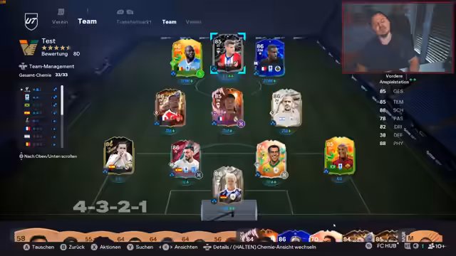 00:28:05Der Streamer diskutiert verschiedene Formationen und Spieleraufstellungen. Er überlegt, ob er wieder die 4-2-3-1 spielen soll, die ihm gestern gut gefallen hat, oder die 4-3-1-2 mit 90er Tiefe ausprobieren soll. Besonders hebt er die Leistung von Bonny im R-O-M hervor und zieht in Betracht, ihn vorne im Sturm einzusetzen, entscheidet sich aber letztendlich für Lukaku. Es gibt auch eine Diskussion über den „Blitzmodus“ in einem Spiel, bei dem es Schwierigkeiten gibt, Spiele abzubrechen, anstatt sie nur zu simulieren. Er fragt die Community um Hilfe, da er selbst keine Lösung kennt und dieses Problem bereits mehrfach aufgetreten ist. Des Weiteren wird die Wirksamkeit von Finesse Shot Plus in der Evo-Variante gelobt, die vielen Spielern bei Torabschlüssen hilft.