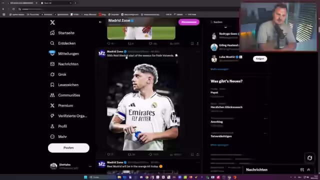 02:01:52Es wird das Gerücht diskutiert, dass Xabi Real Madrid verlassen und stattdessen eine Karriere bei Bayern München beginnen könnte. Dies würde die Vertragsverlängerung von Luka Modric bei Real weiter erschweren. Der Streamer hofft jedoch inständig, dass Modric noch ein Jahr bleibt, da sein Know-how, seine Führungsqualitäten und seine Erfahrung für die Mannschaft unbezahlbar sind und besonders den neuen Coach Xabi Alonso im Umfeld enorm helfen würden. Modrics Wille, auch als Ergänzungsspieler zu bleiben, wird als verdient angesehen.