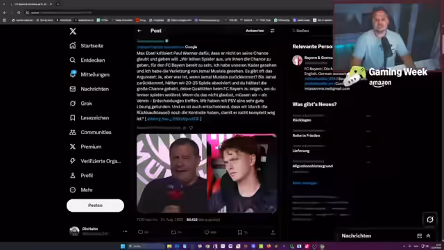 05:56:09Als potenzielle Verstärkungen für Bayern werden Namen wie Nkunku und Sancho diskutiert, jedoch mit erheblichen Vorbehalten. Die Risiken bei einem verletzungsanfälligen Spieler wie Nkunku werden als sehr hoch eingestuft, da das Gehalt und die Marktlage eine verlustreiche Angelegenheit werden könnten. Der Weggang von Wirtz wird im Kontext persönlicher Beziehungen, wie die zwischen Uli Hoeneß und dessen Vater, analysiert. Die allgemeine Situation wird als schwierig und enttäuschend eingestuft, bei der die bisherigen Maßnahmen nicht zu einer nachhaltigen Lösung geführt haben.