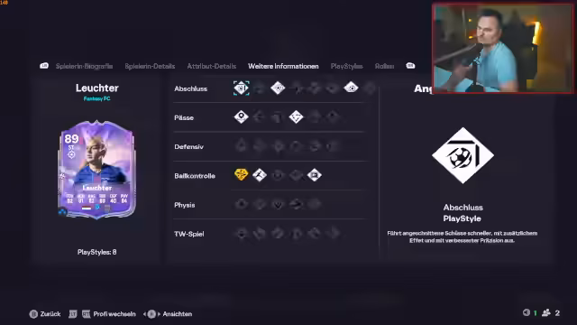 02:46:48Die Entscheidung für die Evolution der Bonny-Karte wird intensiv diskutiert. Der Streamer steht zwischen den Playstyles "Raserei" und "Quick-Step". "Raserei" bietet Vorteile über längere Strecken mit Ball, während "Quick-Step" in beengten Räumen ohne Ball profitabler ist. Die endgültige Wahl fällt auf "Quick-Step", da der Spieler einen "Lean-Toy-Body-Type" hat. Darüber hinaus wird die Evolution eines anderen Spielers behandelt, der nur Stat-Boni und Rollen wie "Low Driven Shot" erhält, was als ärgerlich empfunden wird, da kein wichtiges Stellungsspiel hinzukommt.