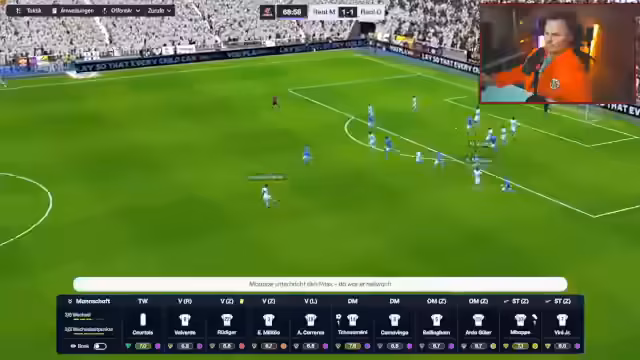 05:47:14Der Streamer spielt ein Simulationsspiel im Football Manager zwischen Real Madrid und Atlético Madrid. Real dominiert das Spiel deutlich und führt bereits mit 4:0. Besonders beeindruckend ist das Zusammenspiel der Spieler, wie Arda Güler, Jude Bellingham und Vinícius Jr. Der Streamer kommentiert das Spielgeschehen und die überlegene Leistung seiner gesteuerten Mannschaft.
