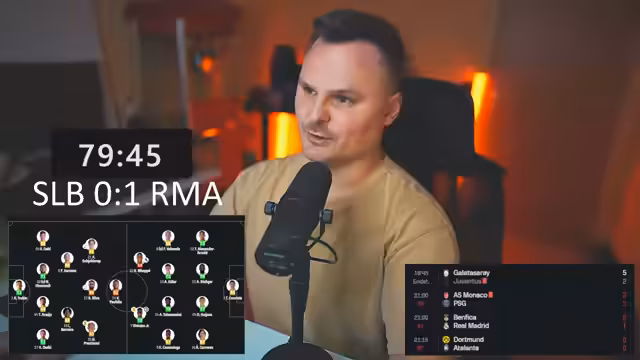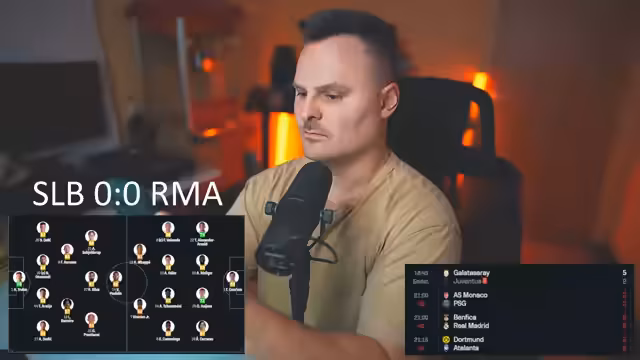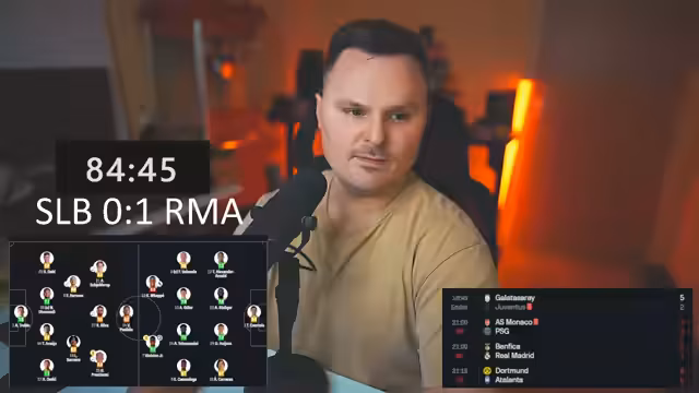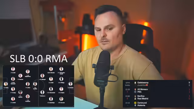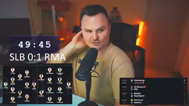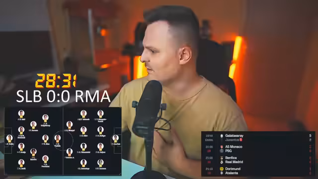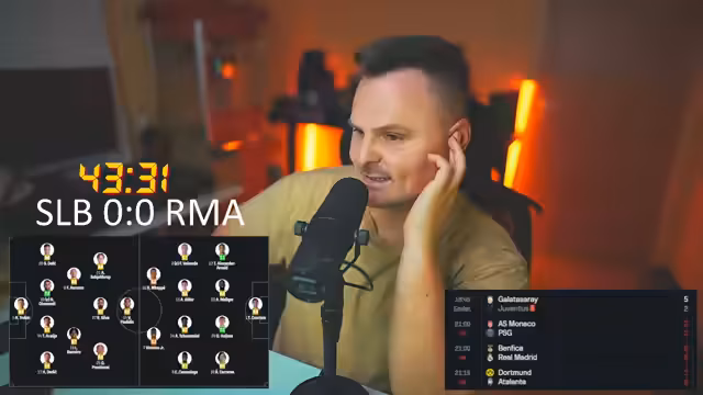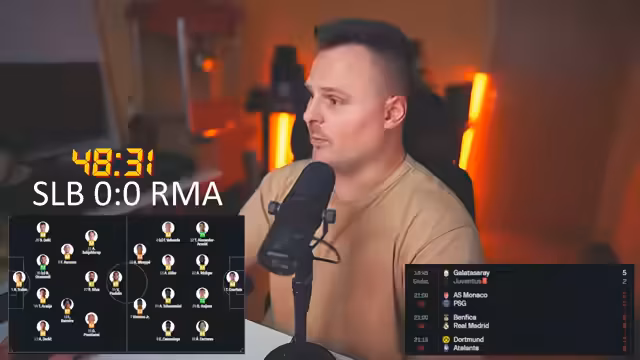 04:46:29Die Live-Übertragung von Real Madrid gegen Benfica beginnt. Der Streamer ist besorgt über die frühe Spielweise von Real Madrid, während Benfica als spielstärker wahrgenommen wird. Die Aufstellung von Real Madrid wird kritisch hinterfragt, insbesondere die Position von MAP. Gleichzeitig laufen andere Partien, wie Monaco gegen Paris Saint-Germain, die ebenfalls analysiert werden. Der Streamer erwähnt ein frühes Tor von Monaco gegen Paris und kommentiert die Umstände des Spiels intensiv.