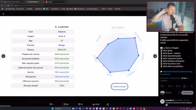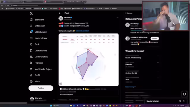 02:05:25Der Stream beginnt mit einer Diskussion über die Leistungen von Florian Wirtz und Martin Odegaard, wobei Wirtz in mehreren Statistiken wie Key Passes und Progressive Passes die Nase vorn hat. Es folgen Gerüchte um Lamine Yamal, dessen schwächste Saison technisch als eine der schwächeren angesehen wird, während gleichzeitig Real Madrid angeblich bereit sei, 100 Millionen Euro für ihn zu zahlen, was als unrealistisch eingestuft wird. Weitere Spekulationen um Spieler wie Rafael Leao und Joao Pedro werden erörtert, wobei Leaos Wechsel zu Bayern München für 60-70 Millionen Euro als realistisch gilt, während Rodrigo von Real Madrid als konkreter Kandidat für einen Wechsel erscheint.