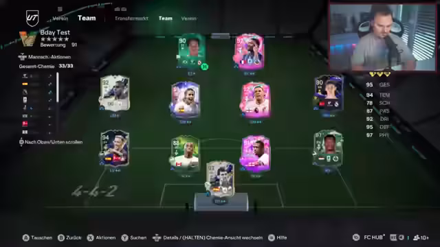 00:36:00Der Streamer analysiert sein Team und überlegt, Girasi auszuprobieren, ist aber skeptisch. Er bemerkt, dass Isco linker Mittelfeldspieler sein kann und diskutiert die Rollenverteilung im Team, insbesondere Yen mit Box-to-Box-Fähigkeiten. Er äußert sich enttäuscht über Davies und dessen Leistung gegen Malen. Marquisio wird mit einem anderen Camp-Style versehen und Guardian gegeben, da er bisher nicht überzeugt hat. Eine neue Evo wird vorgestellt, aber der Streamer ist unsicher, ob sie gut ist und ob Musiala passen würde. Er analysiert die verfügbaren Upgrades und Playstyles, ist aber nicht überzeugt, dass die Evo die 100k wert ist. Er diskutiert, welche Spieler von der Evo profitieren könnten, wie z.B. Nkunku. Abschließend äußert er, dass er von der Evo nicht überzeugt ist und dass man die richtigen Spieler dafür haben muss. Er überlegt, ob Soares bald eine Special-Karte bekommt und testet Girasi mit Basic-Einstellungen, ist aber skeptisch wegen fehlender Quick-Step oder Raserei.