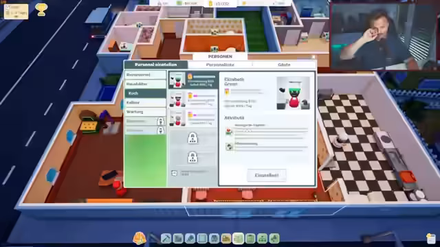 03:36:03Die Komplexität des Spiels nimmt zu, als es um das Management des Personals geht. Der Streamer wählt Angestellte mit spezifischen Eigenschaften aus, wie 'Barliebhaber', 'Teck-Dinosaurier' oder 'Streber'. Die Charaktereigenschaften beeinflussen die Arbeitsgeschwindigkeit und die Stimmung im Hotel. Gleichzeitig muss er das Hotel mit Möbeln und Einrichtungen ausstatten und feststellen, dass seine Einnahmen bei 5-Sternen-Bewertungen bei über 1000 Dollar pro Nacht liegen.
