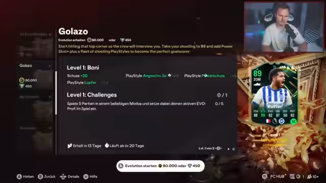 00:20:00Der Streamer startet den Stream mit einem Rückblick auf das Real Madrid Spiel und kündigt an, den Cup für Maldini zu spielen. Er äußert sich zu einer roten Karte in einem anderen Spiel und wundert sich, warum ein bestimmter Schiedsrichter immer gegen den VfB pfeift. Es werden erste Eindrücke von den niedrig bewerteten Evos mit Hammerwerten diskutiert. Der Fokus liegt auf dem Erreichen von 25 Siegen in 36 Partien, um Maldini zu erspielen. Der Streamer plant, mit einem 86er Team anzutreten und überlegt, wie er sein Team am besten zusammenstellt, wobei er Spieler wie Lampard und Campbell in Betracht zieht. Er analysiert verschiedene Spieler und Playstyles, darunter Zico und Havertz, und diskutiert die Vor- und Nachteile verschiedener Kombinationen. Es wird die neue Evo mit 99 Schuss bewertet und für maximal unnötig befunden, da die meisten Karten mit so geboosteten hohen Schuss Stats nicht so doll sind. Der Streamer äußert sich über Real Madrid und deren Antrag auf ein anderes Spieldatum. Es wird überlegt, welche Spieler in die 99 Evo schießen sollen, wobei Ito und Götze verworfen werden. Der Streamer bastelt an seinem Team herum, um die Anforderungen des Cups zu erfüllen, und probiert verschiedene Spieler und Formationen aus. Dabei werden Spieler wie Lampard, Lukeba, Klostermann und Kimmich in Betracht gezogen.