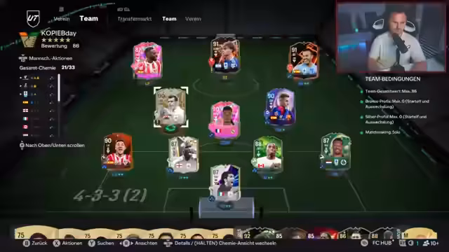 00:23:08Der Streamer beschäftigt sich intensiv mit der idealen Besetzung für das Turnier. Er analysiert verschiedene Spieler wie Havertz und Zico, deren Playstyles und Tauglichkeit für sein Team. Die Diskussion schließt die Innenverteidigung mit Spielern wie Lukeba, Klostermann und Markengo ein und zeigt den fortlaufenden Optimierungsprozess des Kaders auf. Gleichzeitig wird die Kritik an bestimmten Karten, wie einer 99-Schuss-Evo, geäußert, da deren Wert im aktuellen Meta infrage gestellt wird.