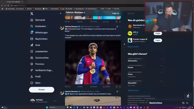 03:17:40Der Streamer beginnt mit der Analyse von Fußballspielern und Transfers. Er hebt Bruno Fernandes als den besten Transfer von Manchester United in den letzten 10 Jahren hervor, der als konstanter Leistungsträger und „Lebensversicherung“ fungiert. Auch Thomas Müller und seine Vorlagen werden gelobt. Die Lage in der Premier League wird besprochen, mit Manchester United und Tottenham in der Krise, während Arsenal als Verfolger hinter Spitzenreiter Liverpool gesehen wird.