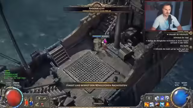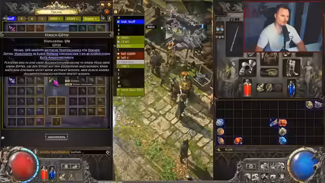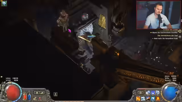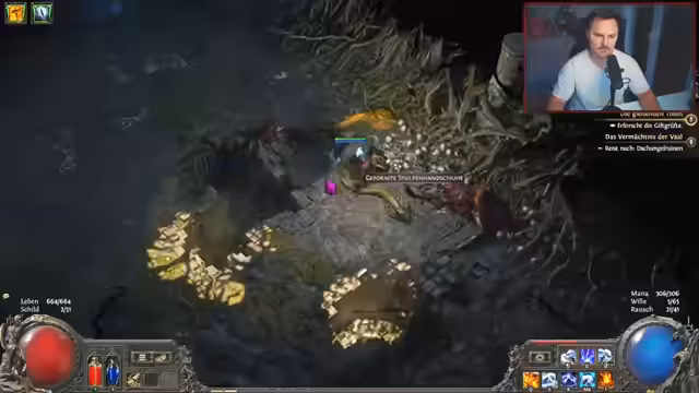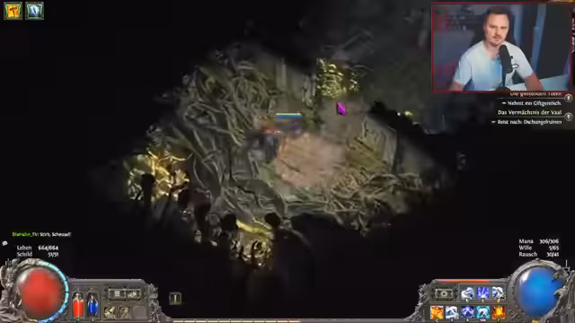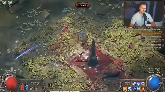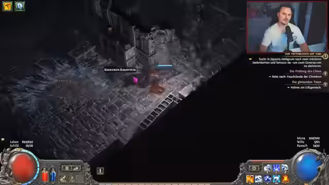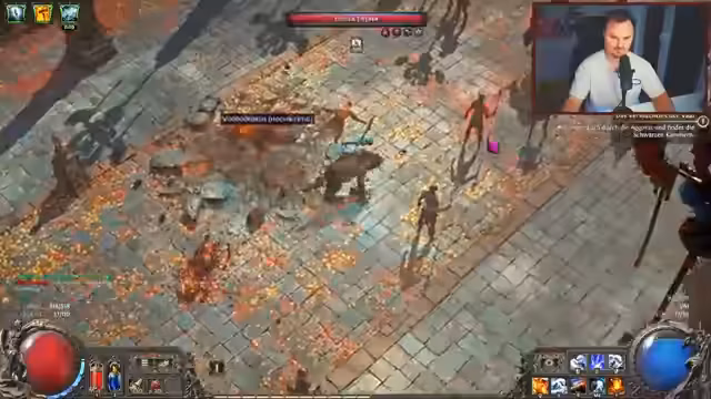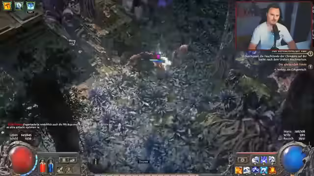 00:25:48Der Livestream zum Druiden-Build 'Explosions Druiden' beginnt mit einem euphorischen Start. Der Moderator stellt seinen frischen Druiden-Charakter vor, der mit einem magischen Zauberstab wie ein 'Harry Potter' agiert. Trotz Kopfschmerzen und Magenproblemen (Altschmerzen mit 30) wird das Gameplay gestartet. Es folgen erste Kämpfe mit dem Schwerpunkt auf Wirkungsbereichsoptimierung und elementalern Eigenschaften wie Entflammbarkeit. Diskutiert werden Basisattribute wie Immunität gegen Bluten vs. Giftwiderstand.
