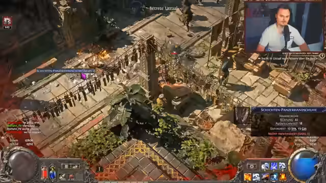 00:42:03Nach Interaktion mit Zuschauern (u.a. 'Moin' an Raphael) werden Gegenstände geprüft. Rüstungen mit Attributen wie Rüstung (90) und Ausweichen (79) werden analysiert. Der Aufbau von 'Rausch' (Sustain-Mechanik) wird diskutiert, da jeder Rausch Lebensregeneration bietet. Es folgt ein Vergleich von Schwächen (z.B. fehlender Feuerwiderstand) und der Entscheidung, den Wirkungsbereich zu maximieren. Ein 'Buch der Spezialisierung' wird für Bonus-Attribute wie verlängerte Kampfschrei-Geschwindigkeit gefunden.