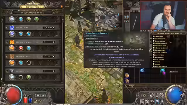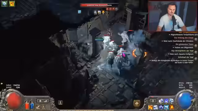 04:24:32Der Streamer stellt seinen Druiden-Build vor, der auf Explosionen und Einfrieren von Gegnern setzt. Er erklärt die Kernmechaniken: Angriffsgeschwindigkeit für häufigere Treffer, Einfrieren von Gegnern, um Rüstungen zu zerbrechen und Eissplitter-Explosionen auszulösen. Wichtige Passives sind Schadensverteilung, Lebensraub und erhöhter Flächenschaden. Der Build kombiniert Elementarschaden mit physischem Schaden durch Rausch-Aufbau, der bis zu 48% mehr Schaden bringt. Ziel ist es, Gegner schnell einzufrieren und durch Explosionen zu vernichten.