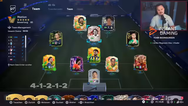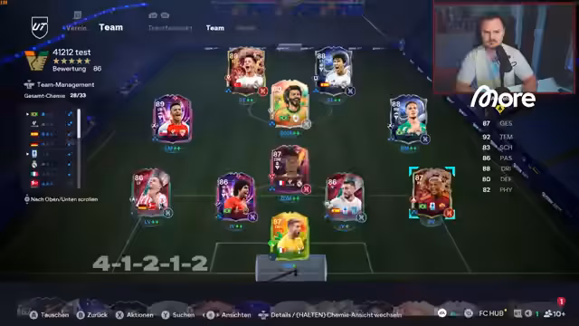 00:38:09Die Hauptaktivität ist das Spielen von FIFA 24. Der Streamer testet verschiedene Formationen, darunter eine 4-1-2-1-2 breit, und berichtet über gespürte Gameplay-Veränderungen, obwohl im offiziellen Patch nichts verändert wurde. Es gibt umfangreiche Diskussionen über das Team-Building, insbesondere die Evolution von Spielern wie Anthony, dem neue Playstyles wie Raserei, Finesse und Tiki-Taka gegeben werden, um seine Torgefahr und Spielweise zu optimieren.