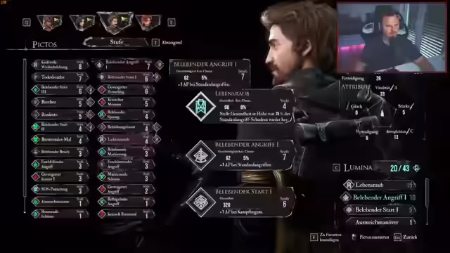 02:57:39Die Kämpfe in dem RPG-Teil des Streams werden als sehr intensiv und herausfordernd beschrieben. Der Streamer muss seine Attribute und Ausrüstung strategisch steigern, wobei Gesundheit und Crit-Chance im Fokus stehen. Es wird über Fähigkeiten wie Lauffeuer, Wärmeübertragung und kritische Treffer diskutiert. Die Kämpfe erfordern ein perfectes Parieren, Ausweichen und das Management von Status-Effekten wie 'Brennen', um AP zu generieren und Schaden zu maximieren.