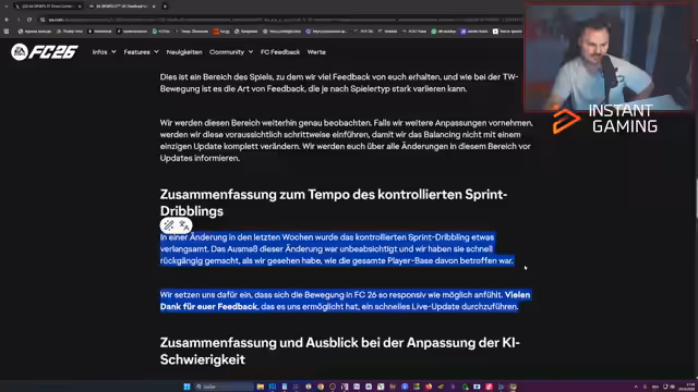 00:34:18Der Streamer liest das November Feedback Update von EA vor, das Verbesserungen, Untersuchungen und zukünftige Erwartungen zu Torwartbewegungen, KI-Verteidigung, PC-Feedback-Umfrage und Plänen für 2025 enthält. Er diskutiert die Effektivität von Torwartbewegungen, die ab Dezember reduziert werden soll, um eine bessere Balance zwischen Schüssen und Torwartaktionen zu schaffen. Er lobt die Entscheidung, punktuelle Updates einzuführen, um das Balancing nicht komplett zu verändern. Die Zusammenfassung zum KI-Abwehrspiel erwähnt Änderungen, bei denen KI-Verteidiger passempfangende Profis am Strafraum weniger eng decken. Dies wurde aufgrund des Feedbacks vorgenommen, dass Spieler ihre gesteuerten Profis aus der Abwehr nahmen, um die KI die Arbeit machen zu lassen. Der Streamer betont die Schwierigkeit, eine Balance zwischen Spielern zu finden, die nicht verteidigen können, und denen, die die Mechanik besser verstehen. Er bedankt sich bei Haste und Apex Predator für ihre Resubs und diskutiert die Verlangsamung des kontrollierten Sprint-Dribblings (R1), die unbeabsichtigt war und schnell rückgängig gemacht wurde. Er fragt sich, ob dies bedeutet, dass das Tempo so bleiben soll, um das Spiel responsiver zu machen. Er erwähnt auch, dass die KI in Squad Battles den Ball zu lange hält und plant, die KI stärker auf Angriffe auszurichten. Er ist verwirrt über die PC-Feedback-Umfrage, da er Multiple-Choice-Fragen erwartet hätte. Er erwähnt ein kleines Stabilitätsupdate und ein größeres Update für Anfang Dezember, das Neuerungen und Festtagsstimmung bringen soll, ist aber enttäuscht über die vagen Informationen und das Gefühl, dass EA die Spieler nur warmhalten will. Er bedankt sich bei Felinio für den Resub und spricht über seine Urlaubserlebnisse, insbesondere die Magen-Darm-Probleme, die er und seine Familie hatten.