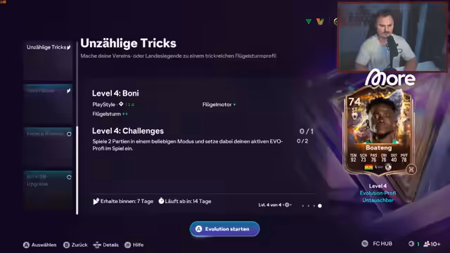 01:49:08Der Streamer äußert seine Absicht, den Spieler Endrick 'bis zum bitteren Ende zu züchten', was bedeutet, ihn durch Evolutionen zu verbessern, um seine Stärke, Sprengkraft und Ausdauer zu maximieren. Er überlegt auch, Dzeko in eine Tempo-Evolution zu packen, um ihn schneller zu machen, obwohl er zugibt, dass die Karte ansonsten 'käsig' sei. Im weiteren Verlauf öffnet er Shop-Packs und freut sich über eine 'Jaco Finesse' Karte mit Tempo. Er hofft auf ein Icon Pack und äußert seine Enttäuschung, dass er die letzten beiden Real Madrid-Spiele verpasst hat. Die Diskussion dreht sich kurz um kosmetische Blitze für Spieler und deren Kosten von 10.000 Münzen. Er entdeckt eine Evolution für Boateng, die ihm ein 'Technical' Playstyle verleihen würde, was ihn begeistert. Er fragt sich, wann die neuen Evolutionen herauskamen und ob er für das Design immer wieder neu verbinden muss.