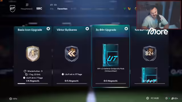 01:57:01Der Streamer plant, ein Shop Pack zu öffnen und fragt die Zuschauer, welches sich lohnen könnte. Er freut sich über die Rückkehr der 'Man of the Matches'-Karten mit Spielern wie Mbappé, Vitinha und Rice. Er öffnet ein Pack und ist enttäuscht über den Inhalt. Anschließend wendet er sich einem 'Basis-Icon-Upgrade' zu, für das er Spieler mit Ratings von 88, 87, 85 und 86 benötigt. Er beschließt, alles in das 'Icon-Ding' zu investieren, obwohl er die benötigten Coins nicht hat. Er muss zunächst 'Silber-Gold-Upgrades' und andere tägliche Aufgaben erledigen, um die notwendigen Spieler zu erhalten. Er erwähnt, dass er Bergkamp und Beckham gezogen hat, während er selbst bisher kein Glück hatte. Er muss vorsichtig sein, welche Silber-Spieler er verwendet, da diese 'fummelig' werden können. Er fragt sich, ob er einen 'geilen Gonzalo' durch Evolutionen züchten kann, ist aber skeptisch.