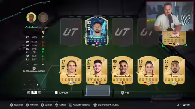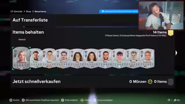 00:37:10Der Streamer beginnt damit, Packs zu öffnen und verschiedene Spieler zu bewerten. Er ist besonders beeindruckt von einigen Spielern wie Dybala und Nico Pasalic, die ihre Ratings verbessern. Es werden verschiedene Team-Konfigurationen und Spielpositionen diskutiert. Der Streamer äußert sich positiv zu einigen Spielern, während er andere als weniger geeignet für sein aktuelles Team ansieht. Er erwähnt auch den Wert bestimmter Spieler im aktuellen Marktkontext.