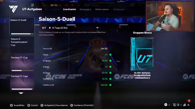 01:40:22Der Streamer spricht über Aktivitäten im FIFA Ultimate Team (FUT). Er beschreibt Herausforderungen im Zibabu-Cup, bei dem er auf Hacker traf, was ihn frustriert. Um die nötigen Tokens zu erhalten, versucht er, Aufgaben in der Liga zu erfüllen, wie etwa sechs Siege zu erzielen, französische Spieler aufzustellen oder spezielle Tore wie Low-Driven-Shots zu schießen. Es geht um die strategische Zusammenstellung seiner Teams und das Erreichen von Zielen in Events.