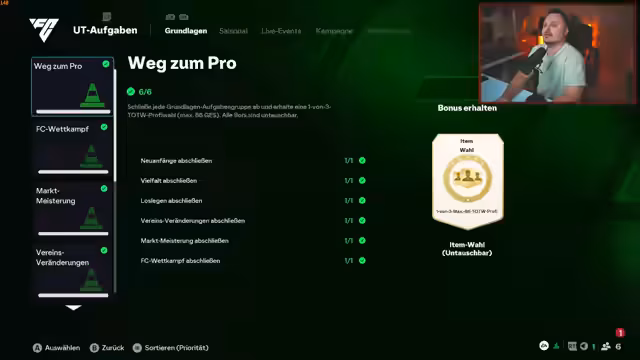 03:00:00Der Streamer beschreibt, wie er vergeblich versucht, seine täglichen Aufgaben im FIFA-Modus, wie einen flachen Schuss oder einen Sieg, zu erfüllen, was ihn in den Cup zwingt. Gleichzeitig sucht er nach dem Livestream der UEFA-Auslosung und diskutiert mit dem Chat über die Eventstrategie. Es geht um die Effizienz, Aufgaben zu erledigen und die ungewisse Zukunft der physischen Events.