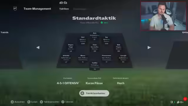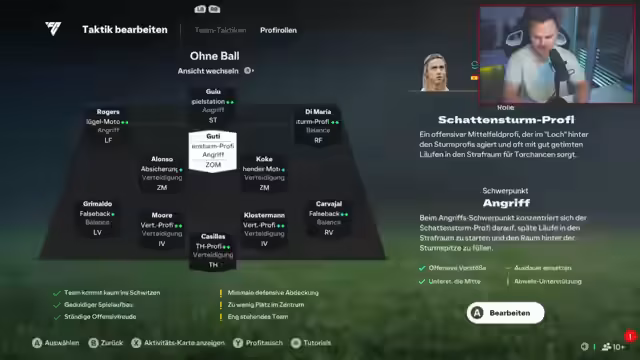 01:51:12Der Streamer testet intensiv eine 4-5-1 Formation, die er als krank und bockstark beschreibt, besonders im gegen 4-3-3. Er variiert die Rollen der ZOMs und experimentiert mit Camp-Styles wie Shadow Striker und Marksman für den Rogers, um die Offensive zu optimieren und bessere Laufwege und Positionierungen für seine Spieler zu erreichen. Trotz des Potenzials gibt es weiterhin Probleme mit der Defensivstruktur und dem Positioning.
