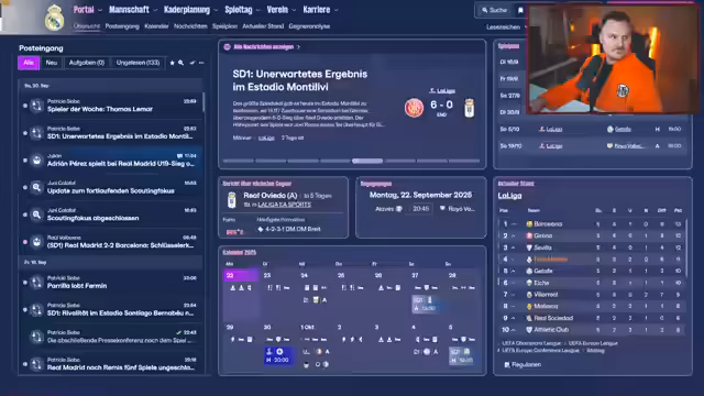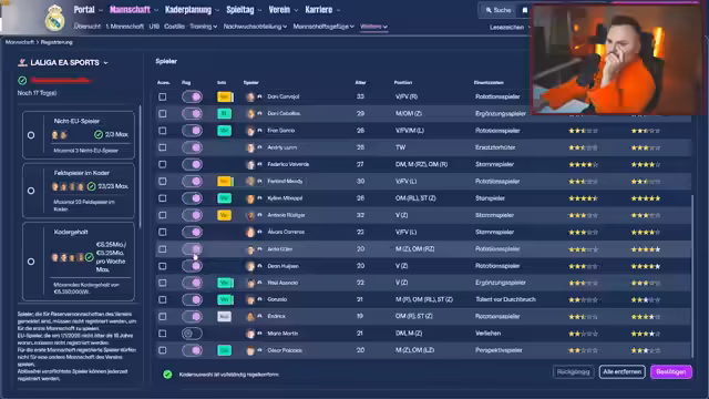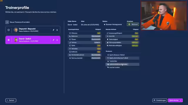00:29:45Nach den anfänglichen technischen Problemen beginnt der Streamer mit einem Karrierestart-Modus im FC 24. Er übernimmt die sportliche Leitung von Real Madrid mit dem Ziel, den Verein zu retten. Als Trainer wählt er einen fiktiven Charakter namens Damir Salkic, bosnisch-deutscher Nationalität, der mit starken Motivationsfähigkeiten und einer offensiven Ausrichtung glänzt. Er richtet den Kader in der zweiten spanischen Liga ein, um von dort aus aufzusteigen.