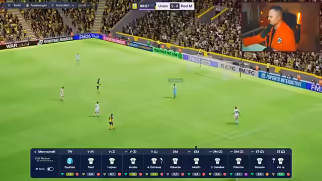 01:11:57Nach der erfolgreichen Einführung und der ersten Pressekonferenz absolviert der Streamer sein erstes Testspiel mit der zweiten Mannschaft von Real Madrid. Obwohl die Gegner als schwach eingestuft werden, startet das Team verhalten. Der Durchbruch gelingt durch einen Konter über Vini Jr., der den Ball auf Carreras spielt und dieser per Schuss trifft. Das Spiel wird gewonnen und der Streamer zeigt sich zufrieden, auch wenn er betont, dass die Gegner kein Maßstab sind. Er merkt jedoch bereits an, dass Mbappé nicht zu überzeugen scheint.