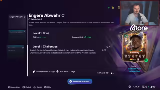 02:13:07Es wird eine besondere Evolution einer Silberkarte vorgenommen, die aus der Asche aufsteigt und eine Karte sein wird, die alles in den Schatten stellt, trotz eines Ratings von 80. Es handelt sich nicht um eine super OP-Karte, sondern um einen Spieler, der den Streamer durch die letzten Silber Cups getragen und entscheidende Tore geschossen hat. Diese Karte, insbesondere der Spieler namens "Board Hängen", wird als außergewöhnlich beschrieben, und es besteht große Vorfreude darauf, die Evolutionen am nächsten Tag abzuschließen und ihn in die Weekend League zu integrieren.