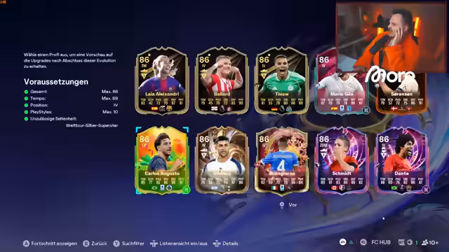 02:05:24Der Streamer spricht über neu gezogene Karten in FIFA 26. Er zeigt die Future-Star-Karte von Gonzalo und ist von deren Stärke beeindruckt. Er analysiert dessen Stärken und Schwächen und gibt einen Hinweis, wie man eine Icon-Evolution für den Stürmer erhalten kann, indem man auf bestimmte SPCs und Reiter-Tausche zurückgreift. Der Streamer stellt fest, dass einige der neuen Future-Star-Karten im Spiel sehr stark performen.