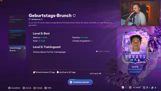 00:24:39Zu Beginn des Streams thematisiert der Streamer die aktuelle Situation in der FIFA Weekly League. Er äußert sich besorgt über die nach dem neuesten Patch deutlich gestiegene Stärke der Wilson R9, die er als gänzlich böse und unangenehm empfindet. Nach einer kurzen Auseinandersetzung mit dem Gameplay-Problem geht es weiter zur Verbesserung seines Boateng, dem er zusätzliche Dribbling- und Ballkontrollwerte sowie die Fähigkeit 'First Touch' verpasst, um seine Schwächen auszugleichen. Währenddessen werden auch andere Spieler wie Pogba erwähnt, die ebenfalls aufgewertet werden könnten, und das Projekt Kaido als zukünftiges Ziel ins Auge gefasst. Der Fokus liegt klar auf dem Grind für die Liga und der Verbesserung des Kaders.