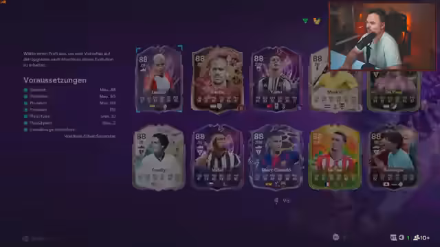08:01:38Nach dem Hauptspiel wechselt der Stream zum Thema FIFA Ultimate Team. Er analysiert neue Karten-Evolutionen und bewertet Stats und Potenzial von Spielern wie Gravenberg, Pogba und Modric. Es werden verschiedene Optionen besprochen, um bestehende Karten zu verbessern oder neue zu erwerben. Der Streamer zeigt sich bei einigen Karten unentschlossen, während andere ihm sehr gut gefallen. Die Zuschauer werden aktiv in die Diskussion einbezogen.