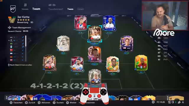 00:32:06Die Effektivität von Rivals-Rewards wird hinterfragt, da viele Spieler aufgrund anderer Spielmodi wie Gauntlet-Sachen genug zu tun haben. Der Streamer hebt die Entwicklung seines Spielers Carlos Alberto hervor, der durch zahlreiche Evos von 70 auf 82 Physis verbessert wurde, was eine deutliche Steigerung von 12 Punkten bedeutet, zusätzlich zu Verbesserungen bei Ausdauer, Sprungkraft und Aggression. Das Team wird weiter optimiert, wobei Oliver Kahn für Sicherheit sorgt und Kamavinga als tiefstehender Motor gesetzt wird. Die Dreierkette wird als "sehr sauber auf dem Blatt Papier" beschrieben, jedoch als schwierig in der Umsetzung eingeschätzt. Die Rollensysteme in FC26 werden als limitiert kritisiert, da zu wenige Rollen wirklich einen signifikanten Unterschied machen. Es wird befürchtet, dass die Dreierkette zu riskant sein könnte, da die äußeren Innenverteidiger oft die Rolle von Außenverteidigern übernehmen müssen, was zu großen Lücken führt.