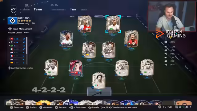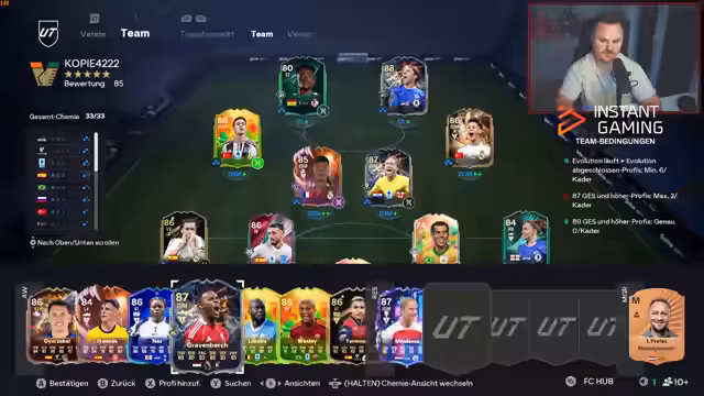 01:47:26Der Streamer beschäftigt sich wieder intensiv mit dem Gameplay. Er testet verschiedene Taktiken und Team-Upgrades, wie z.B. einen Pogba mit 99 Dribbling. Er analysiert die Stärken und Schwächen seiner Spieler, insbesondere der Flügel, und diskutiert die Vor- und Nachteile von verschiedenen Playstyles. Das Ziel ist, eine optimale Aufstellung für sein Team zu finden, um seine taktischen Ideen effektiv umzusetzen.