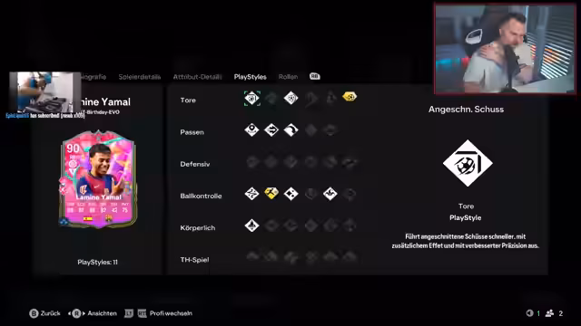 02:00:07Es findet ein direkter Vergleich zwischen verschiedenen Spielern statt. Der Streamer stellt fest, dass die neue Bellingham-Karte ein „Millionen Prozent“ besser ist als sein Totti, und begründet dies mit dem besseren Movement und den technischen Fähigkeiten. Er äußert sich kritisch über die Maradona-Evo, die er als keine „richtige Icon-Karte“ bezeichnet, und äußert seine Bedenken gegen das Design der Bremer SBC.