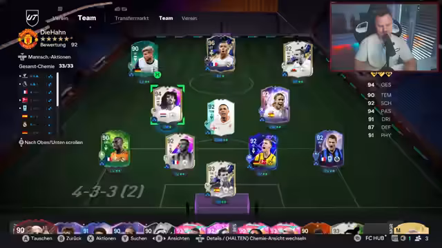 00:32:07Die Analyse konzentriert sich auf diverse FIFA-Karten und deren Bewertung. Insbesondere wird die Karten von Werner, Backe und Hülitz besprochen und deren spielstilbezogene Stärken und Schwächen diskutiert. Der Streamer teilt seine Erfahrungen, dass Werner sich langsam anfühlt und Hülitz auf Basic am besten funktioniert. Es folgt eine Einführung in eine neue 4-3-3-Formation, die als sehr vielversprechend und spaßig beschrieben wird, mit dem entscheidenden Hinweis, einen klaren Sechser im Mittelfeld zu positionieren.