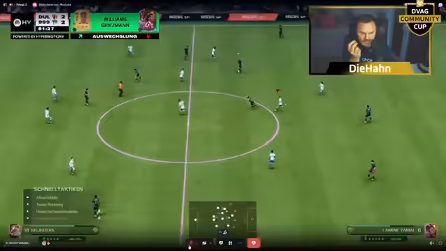04:18:19Das Finale entwickelt sich zu einem spannenden Match, in dem DBK das Gefühl hat, im zweiten Spiel einen Vorteil zu haben, da er im Hinspiel auswärts geführt hat. Die Streamer diskutieren die taktischen Entscheidungen der Spieler, insbesondere Felix' Wechsel zwischen 4-5-1 und 4-2-3-1, was als Überraschungstaktik im Finale interpretiert wird. Die defensive Stabilität von Felix wird gelobt, aber es wird auch angemerkt, dass DBK viel Druck macht. Ein weiteres Tor von DBK durch De Jong, der normalerweise nicht für seine Torgefährlichkeit bekannt ist, führt zum 2:1. Die Streamer sind fasziniert von der Spielweise von DBK, insbesondere seinen Dreieckspässen und dem aggressiven Pressing. Ein Ausgleich zum 2:2 durch Mariona in der 40. Minute erhöht die Spannung weiter. Die Diskussion über die Nutzung von Shielding-Techniken im Spiel zeigt, dass diese hauptsächlich defensiv eingesetzt werden, während offensiv versucht wird, direkten Kontakt zu vermeiden, um nicht den Ball zu verlieren.