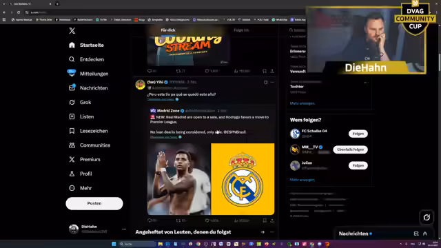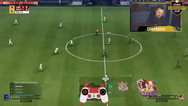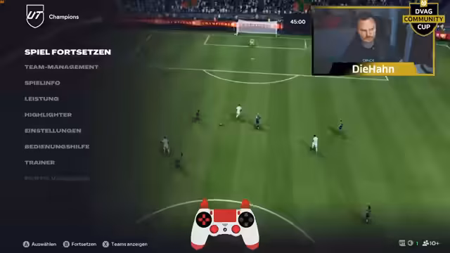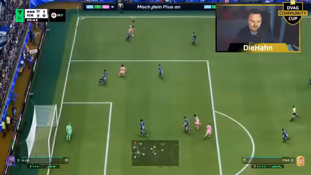 00:24:02Der Streamer begrüßt die Zuschauer zum Finale des DVAG Community Cups und äußert die Hoffnung, dass es allen gut geht. Er erwähnt, dass heute das Finale ansteht und er noch einige technische Anpassungen vornehmen muss, um alles optimal einzustellen. Die Stimmung ist erwartungsvoll, und er freut sich darauf, das Spiel zu beginnen, nachdem er die letzten Vorbereitungen getroffen hat. Er spricht kurz über aktuelle Fußballthemen, darunter Real Madrid und die Situation eines Schalke- und United-Fans, der krank ist, was er als „gefährliche Kombination“ bezeichnet.