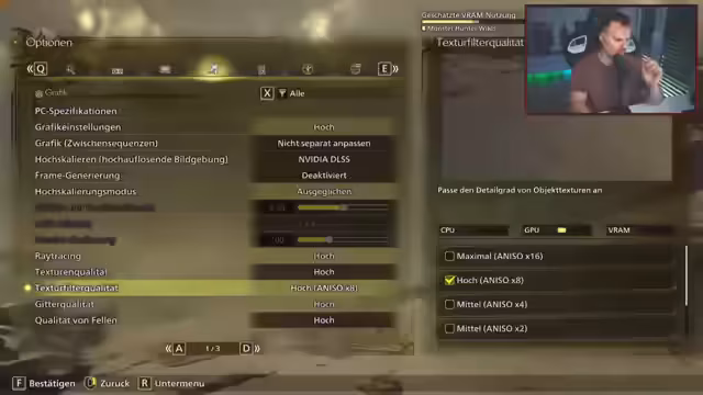 00:23:36Nachdem das Spiel gestartet ist, werden die Bildschirmeinstellungen optimiert. Der Streamer wählt eine unbegrenzte Framerate, deaktiviert V-Sync und setzt DLSS auf die Qualitätseinstellung. Die Grafikdetails wie Texturqualität, Windsimulation, Schattenqualität und Umgebungsbelichtung werden auf das Maximum gestellt. Anschließend beginnt er mit der Charaktererstellung, wobei er sich zunächst für das männliche Preset 'Hoffnung' entscheidet und dann die Aussehenoptionen wie Frisur, Bart und Körperhaltung anpasst, um ein individuelles Erscheinungsbild zu schaffen.