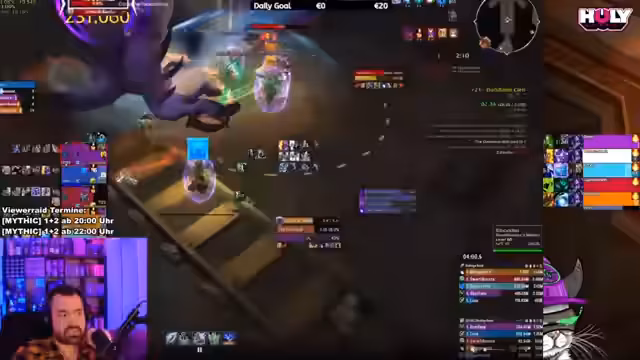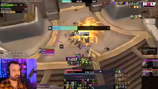 03:00:23Der Streamer wechselt die Perspektive und schaut sich eine 18er-Schlüssel-Gruppe von Perplex, eines der besten Teams der Welt, im Theater of Pain an. Er kommentiert das Setup, das aus einem Feuer-Mage besteht, was aufgrund der hohen Prioritäts-Schaden-Phase ungewöhnlich ist. Während des ersten Bosskampfes bei Wolf Disco analysiert er die Mechaniken, darunter den Pfeiler, das Radianceschadensfeld und das Verwalten der Heiler-CDs. Er bewundert die saubere Ausführung der Gruppe, insbesondere, wie sie einen kritischen Overlap von Fähigkeiten meistert.