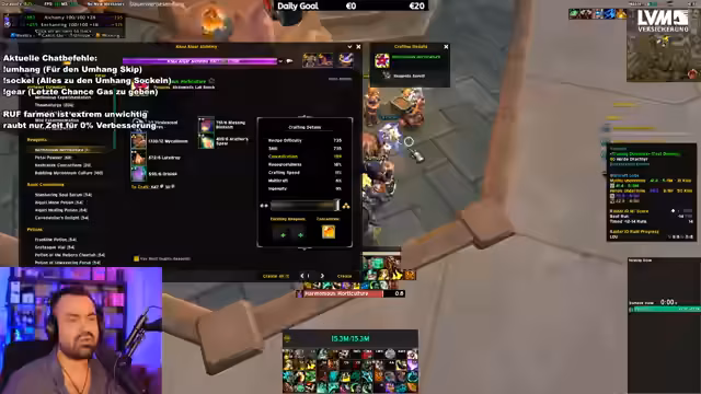 00:00:44Der Streamer beginnt mit ersten Eindrücken von neuen Spielinhalten, insbesondere von neuen Transmogrifikationsmöglichkeiten und Tränken. Es wird eine spontane Entscheidung getroffen, bestimmte Ressourcen wie Brock oder Tränke zu nutzen. Ein Puzzle in der Bauchnabel-Dungeon wird angesprochen, und der Streamer testet sein Glück im Gambeln mit dem Zuschauer 'Taure'. Er äußert Frustration über fehlende Sporen und überlegt, Ressourcen auf der Warbank zu lagern.