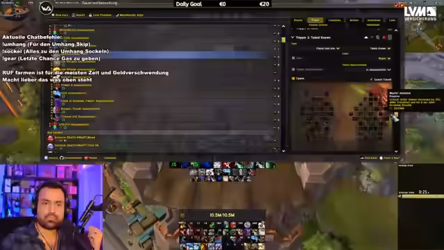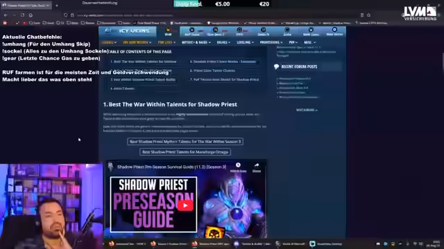 02:56:58Der Streamer gab Ratschläge für die aktuelle Season. Er hielt Berufe für unwirtschaftlich und riet davon ab, Zeit darin zu investieren. Für den Start von Mythic+ Dungeons am Mittwoch wurden schnelle Dungeons wie Tak' Retan und Folly empfohlen. Zudem wurden der Start einer Raid-Gruppe und die Vorbereitung auf zukünftige Inhalte angesprochen, wobei der Fokus auf dem Zusammenhalt und der Organisation innerhalb der Gruppe lag.